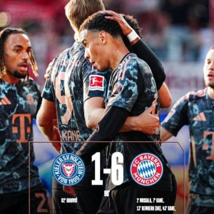 15 01月 2026 33 【德甲】拜仁6比1大胜基尔,穆西亚拉闪击,凯恩戴帽 体坛周报全媒体原创 基尔1比6拜仁 82'吉戈维奇/1'穆西亚拉,7'凯恩,13'伦贝格(乌龙),43'凯恩,65'... 德甲